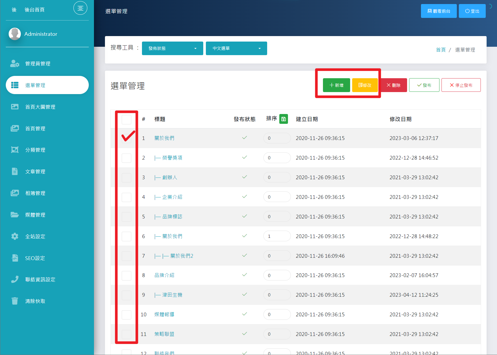 - 點擊右上角【新增】或勾選項目後點擊【修改】進入選單設定內頁